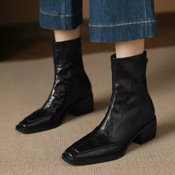 Genuine Leather Square Toe Zipper Boots with Chunky Heel